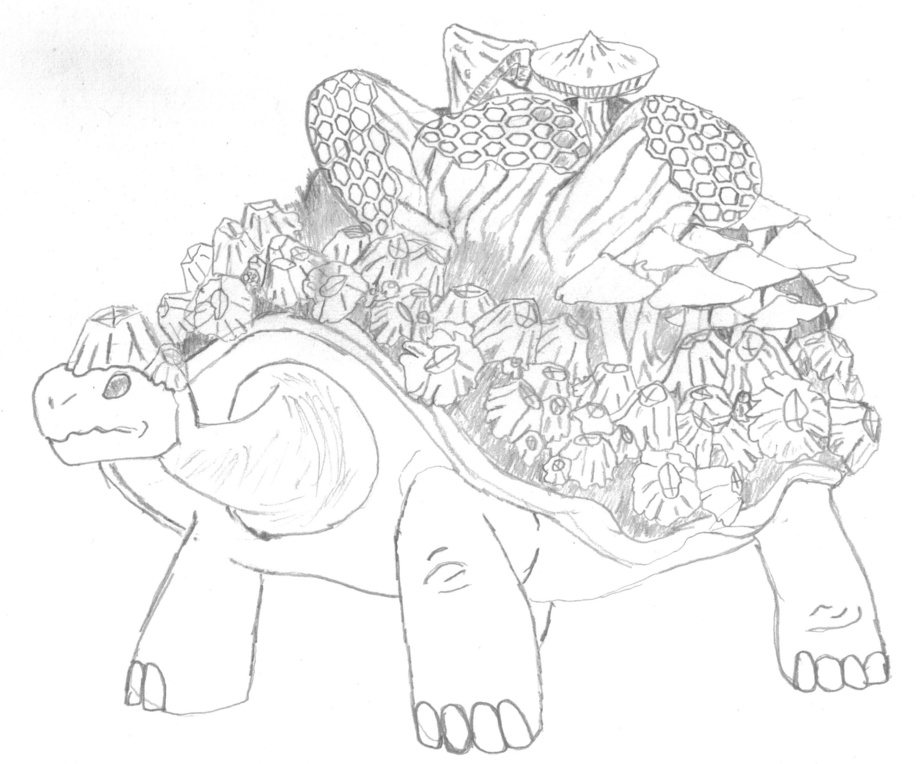 I'm not a good artist so I will admit the outline of the Tortoise is traced from a illustration out of a coloring book. the others are outlined from other zoological sources I found. I used a Galapagos tortoise as the body and wasp nests, barnacles, and mushrooms