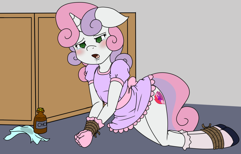 A commission for eccentricpone of the newly marked Sweetie Belle who is fighting to stay awake from being chloroformed and put into bondage by a certain blonde mane, green mare who just found out she’s "legal"