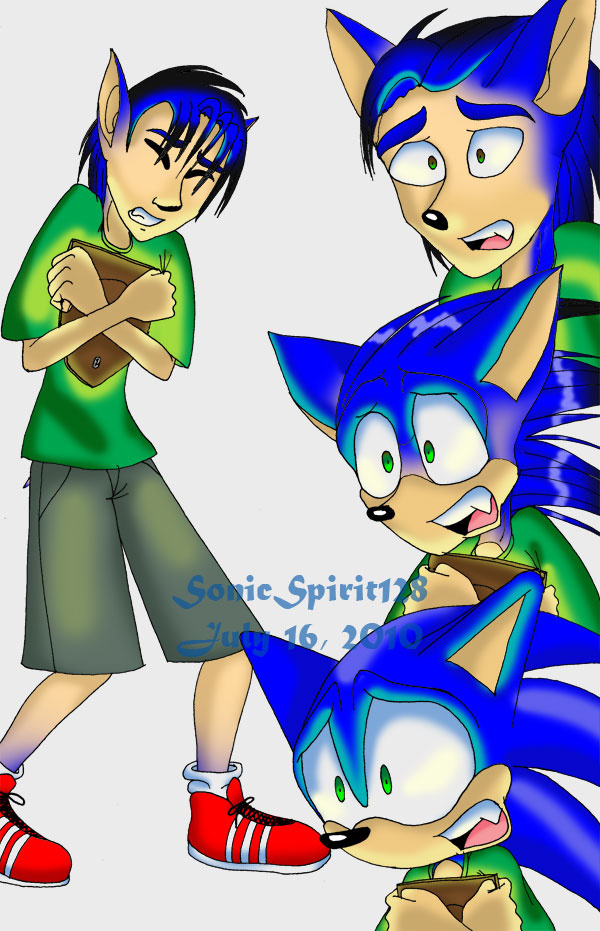 Page 1 of 6--commission for chaos-of-the-end, of a dude turning into Sonic, then Sonic into Mecha Sonic, from Archie comics issue 39, and the Mecha Madness special.