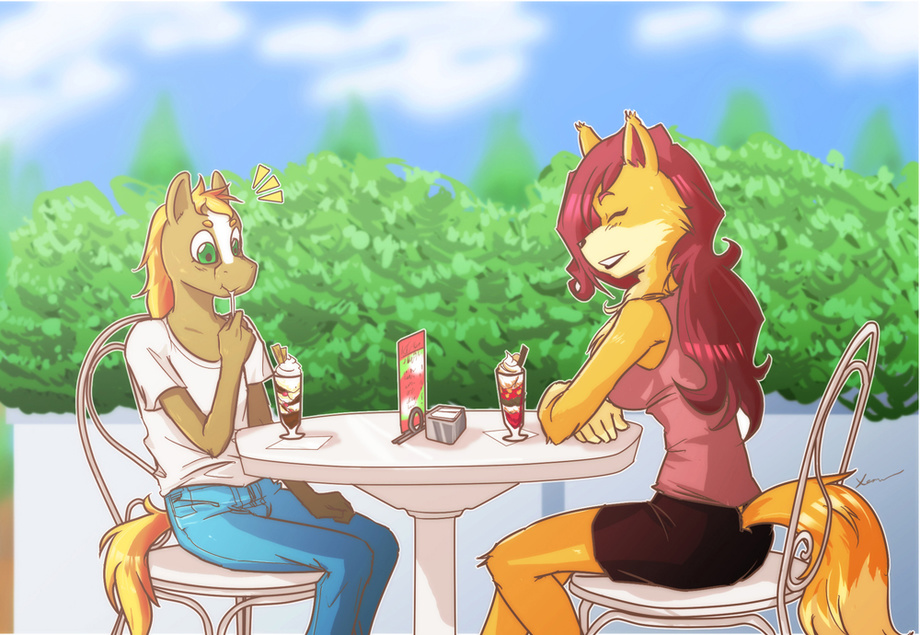 Here we have my OC Simon, a male horse, and Diana, a female fox, having a nice time together eating some ice-cream.