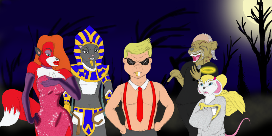 From left to right: Delicious Fox as Jessica Rabbit, Ramus Badger as a Pharaoh, Harold Molerat as Sexy Donald Trump (actual costume... bleh), Levii Hyena as George Carlin, and Judee Mouse as an angel.