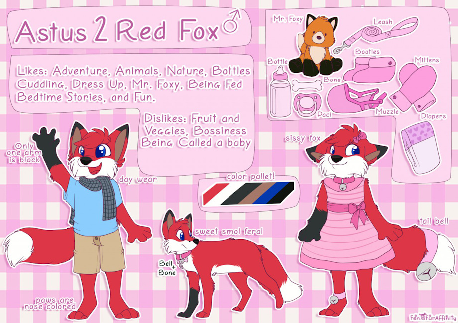 among other things his favorite dress up outfit is a pink frilly dress, with pink booties and mittens, as well as a tail bow situated near the base of his tail.