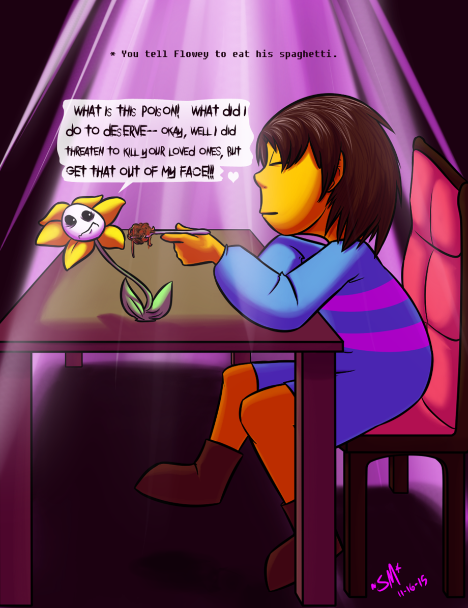 Here we have Frisk and Flowey enjoying some quality time together after a Pacifist run. ;P Also, I have a headcanon that Frisk wears some kind of one-piece clothing since there is no distinction between her shorts and shirt in her sprite. Ye, contributing to a fandom. Haven’t done that in awhile haha.