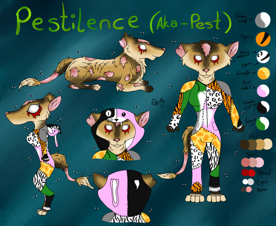 Name: Pestilence (aka Pest) Gender: Female Appearance: Mangy wolf with patches off fur missing, blind eyes and no teeth (just a gummy wolf) Always has flies around her. Anthro is usually seen wearing a onesie made up of patterns of various onesies. Personality: Always ill, coughing and sneezing mainly. Shy and childlike (despite not being a child). Likes warmth and comfort.