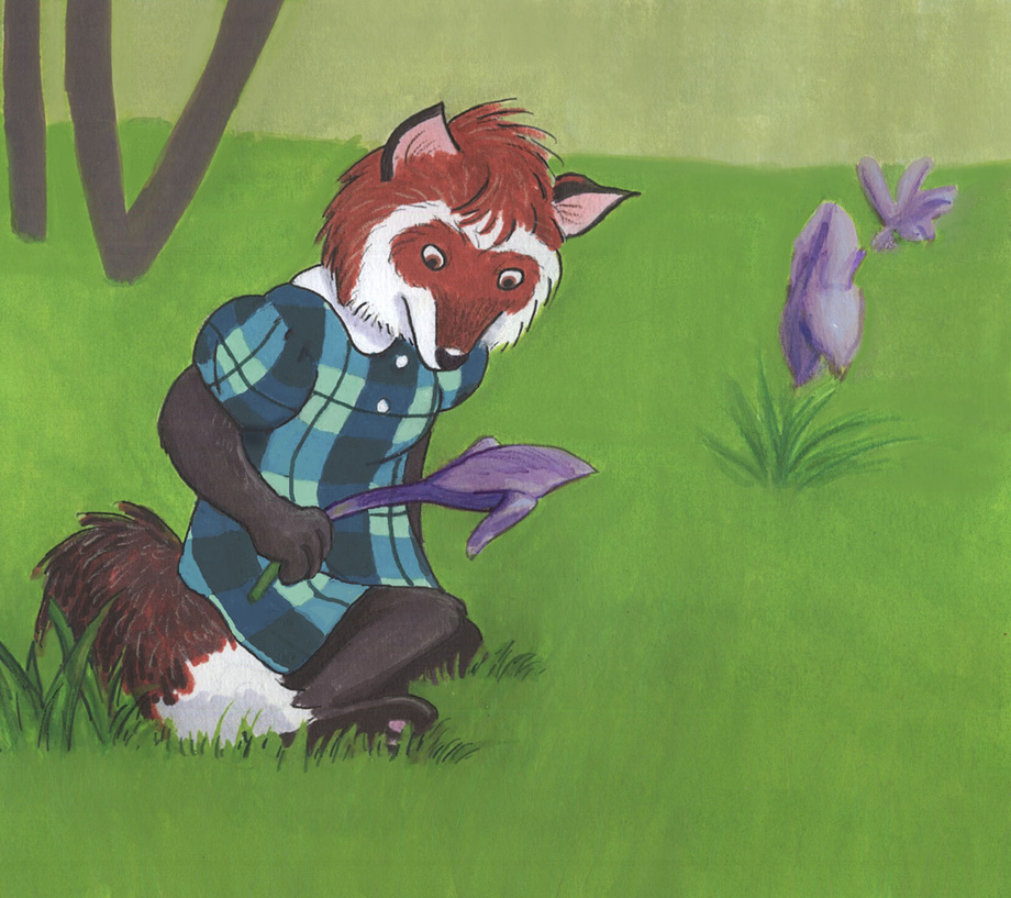 A much newer picture of a fox. Nina, in this case, investigating the new spring blossoms.