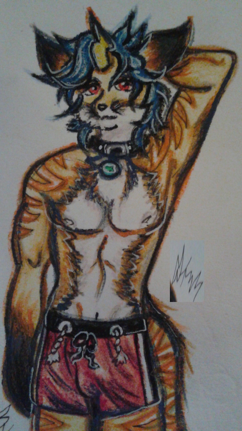 Manny is a fox so he is shaped like a fox with standard fox features but he's also part tiger so he has some tiger markings. Other than that, he has standard fox fur but has a pale yellow/light brown body color to compliment the fur colors of Mana Lai, and a neutral blue hair since Mana Lai has neutral purple. Mana has both red and blue eyes that, blue for normal then red when she focuses magic, so Manny's are just red all the time.