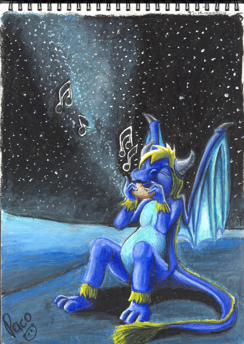 Su fursona tocando la ocarina sobre el pasto, me lo imaginé de esta forma, pensaba colorearlo en digital, pero de la forma en que me imaginaba esta escena me daban muchisimas ganas de colorearlo en tradicional.