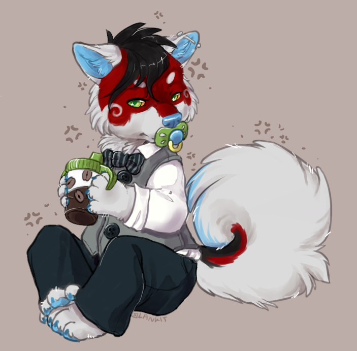 Commish for FriskyPaws on FA, Of her grumpy pup, Vendetta. I had a really fun time doing the bangs on this guy, and the sippy cup design. I kinda wish I had one with coffee beans on it.