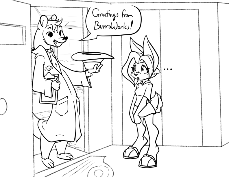 Taking commissions and working on art, as well as continuing 18C’s little story here. She’s talking with a BurroWorks representative. Sorta kinda like Vault Tec! Maybe exactly like that... Time will tell. ^^ Anyways, see you all at the stream!