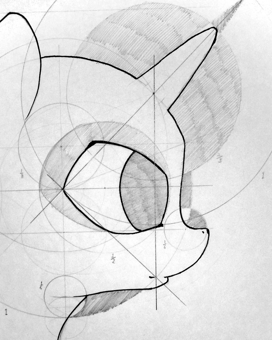 Quick study using a compass and straight edge. I think I've seen this done for show-accurate ponies but I just wanted to break down how I've ended up constructing pony heads (from the side anyway) which, in all honesty, isn't a mile away from the show.... ^.^; Note: I don't go through this process every single time I draw ponies.... ^.^