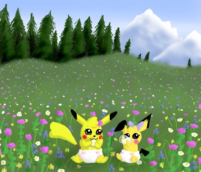 My last minute entry to a "Spring" themed contest on DeviantArt through the dABDL group. I decided to take a couple of Pokemon characters of mine and place them in some nice spring picnic country. For those who don't know; the Pikachu is Peony and the Pichu is her sister Bluebell. This is my first time showing Bluebell with her design and name, however I've had the character in the works almost as far back as Peony.
