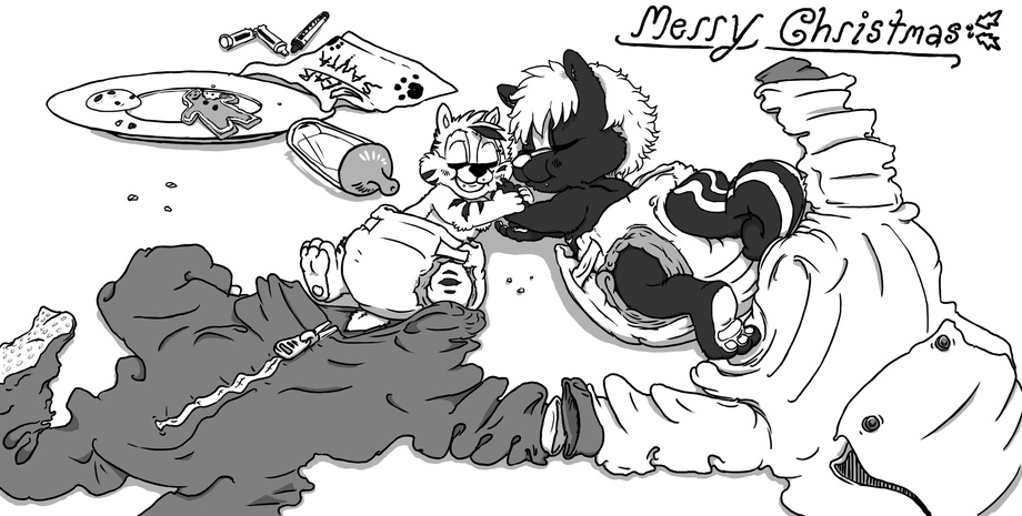 One Christmas Eve, Ozzie and Tavi, adults on the outside, but cubs on the inside, got dressed in their warm sleepers, put out some cookies and a note for Santa. The two waited and waited, and soon fell asleep. But Santa did come, and saw the two lying there. Santa knew how they were on the inside, and decided to make their outsides match. He took a bite of some cookies, then sprinkled magic FOY powder on the two. They both shrank and regressed back into little babies, snuggling together. Their adult-sized diapers shrank with them and kept the bulk they had, making for very thick and comfy padding. Santa smiled and left, knowing the two would wake up in the morning as happy babies to open their presents. But for now, they were just two little babes, snuggling together in dream land.