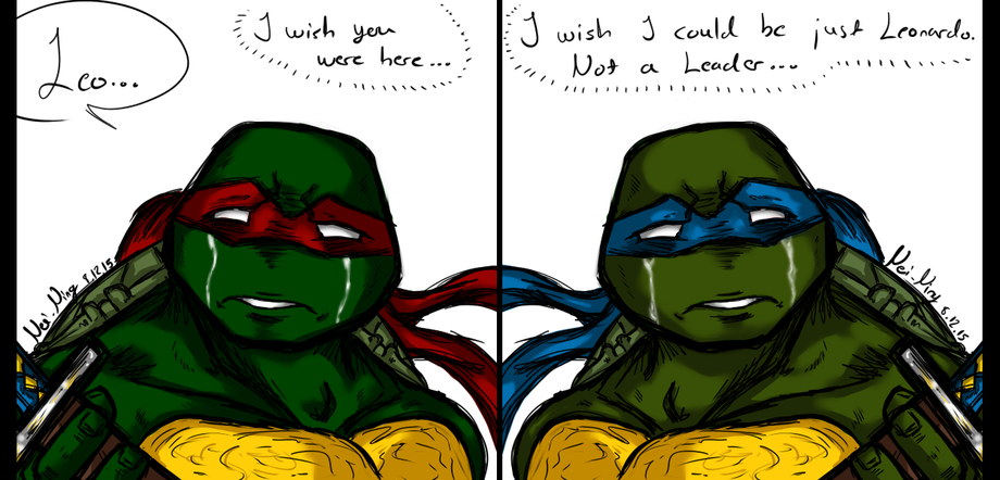 Something what came in my mind while sketching Raph. In Raph's case Leo's gone (either on training or dead) and in Leo's case... I wondered does he ever have moments where he just wishes he could be Leonardo, a teenage boy without such huge responsibilities and duties and he just could enjoy care free life with his little brothers, like they did as small kids.