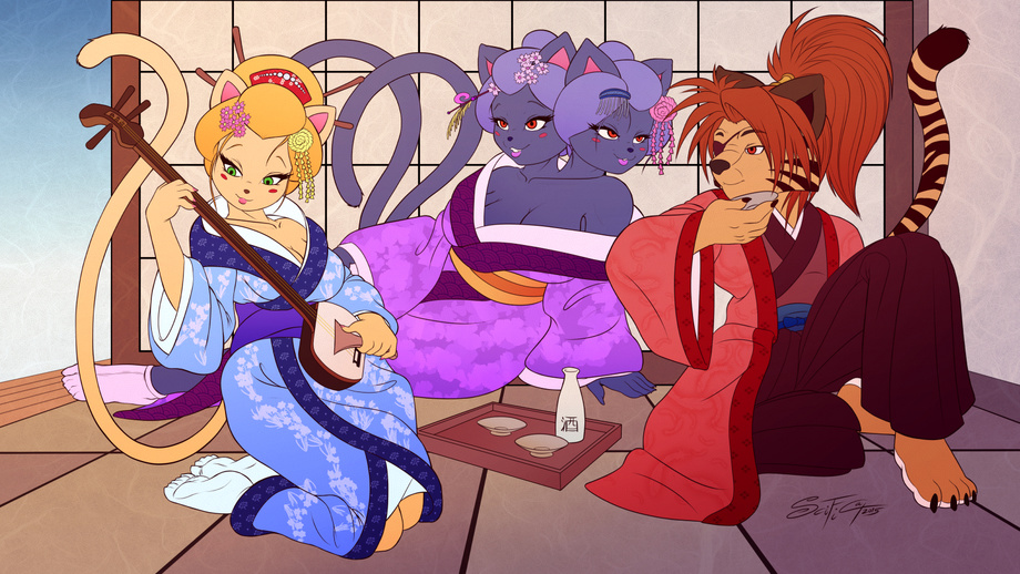 of OCs Team Scratch: Leona, Felicia and Claude uncharacteristically enjoying a moment of peace and relaxation in a very traditional way.