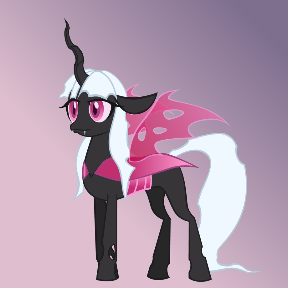Elytra: [image link] The youngest sister, specializing in stealth, intel, and other black operations. Her hair is actually white; she uses a bright pink dye as a sort of rebellion against the bullying she's received. She lacks a crown because she doesn't currently control her own hive, serving as Chrysalis's lieutenant and frequently breaking her out of trouble. "Elytra" are the coverings on the wings of beetles such as ladybugs.