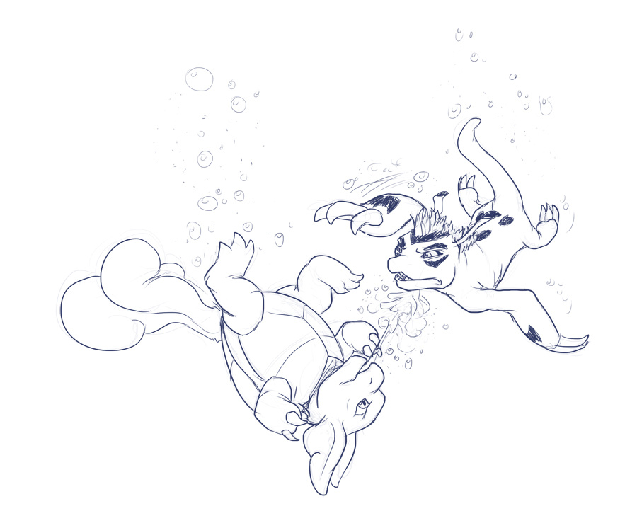 One of my bunny buddies, Spelunker_Sal was doing a commission stream, which was Pokemon themed. Mandatory one Pokemon in each image. Well, I've always been a fan of Wartortle, so he was my choice there. And after a little while of thinking about it, I realized I wanted to see my favorite from the other world, Digimon, out and about as well. And thusly, both being water-based, I decided to go with this. The two fighting it out, to the twisted content of whatever story the viewer, you, may decide.