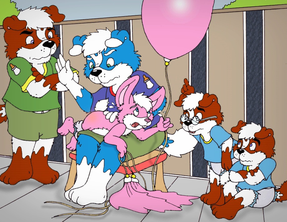 Matt stopped Jimmy's escape and now the pink bunny's butt is even rosier than the rest of him. The tears though are more for having his balloons broken than his bumm busted.