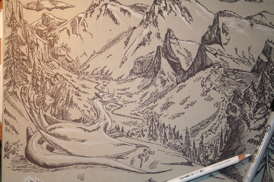 Concept art inspired by Hudson River School art, Led Zeppelin, and the writings of J.R.R Tolkien. Also, sorry that some of the drawing got cut off. A common theme among my submissions is that the photos suck. I must learn how to do digital art... sometime in the future...