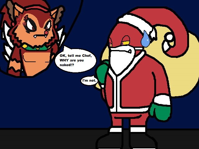 First Pic: Wolfgang is dressed up like a reindeer while Chef Pepper Jack is dressed up like Santa Claus, however, Wolfgang thinks Chef Pepper Jack is naked in this, but is not! Mainly because Santa's outfit is red while Chef Pepper Jack has red skin. LOL XD Poor Jack! But besides that, Pepper Jack will cook up some spicy Christmas meals.
