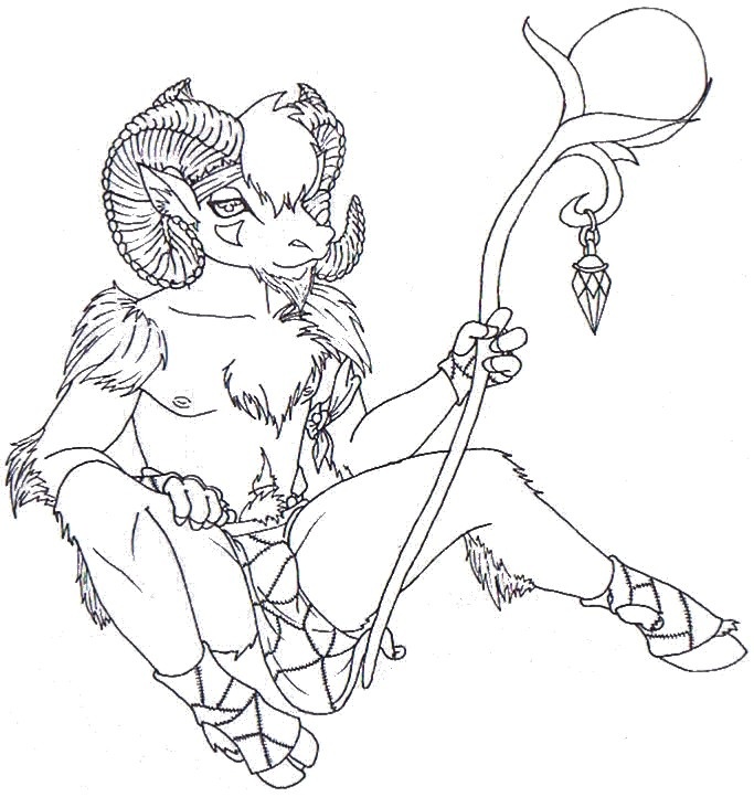 By his patchwork loincloth and accessories, you can probably tell that he works as a tanner; one who cleans, dyes and makes skin into usable fabric. He's an auodad, which is a wild sheep from Africa.