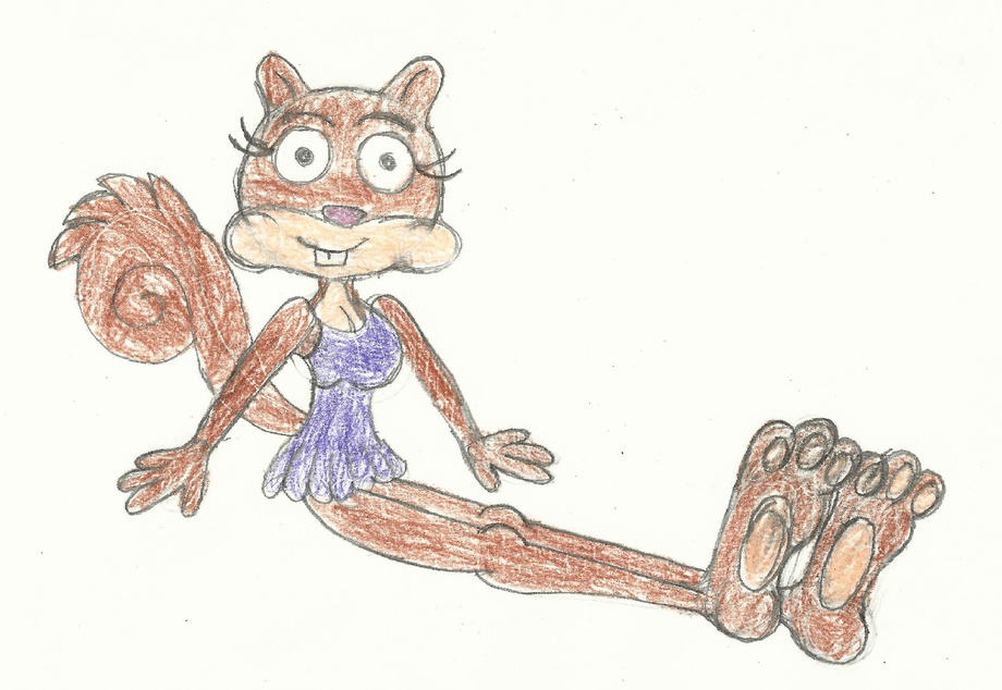 It's about time I drew a foot tease picture of Sandy Cheeks. Here, Sandy is wearing the purple ballet outfit I made a while ago while showing her furry feet to the viewers. I didn't remember what the bottoms of Sandy's tootsies looked like, so I gave her beige pads. (If you've seen it in the SpongeBob episode "MuscleBob BuffPants", you'll know what I mean.)