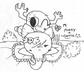 This is my first piece of "The Amazing World of Gumball" fanart. It's of Penny (an antlered peanut cheerleader who has a crush on Gumball) and Carrie (A depressed dead-beat ghost who enjoys being miserable).
