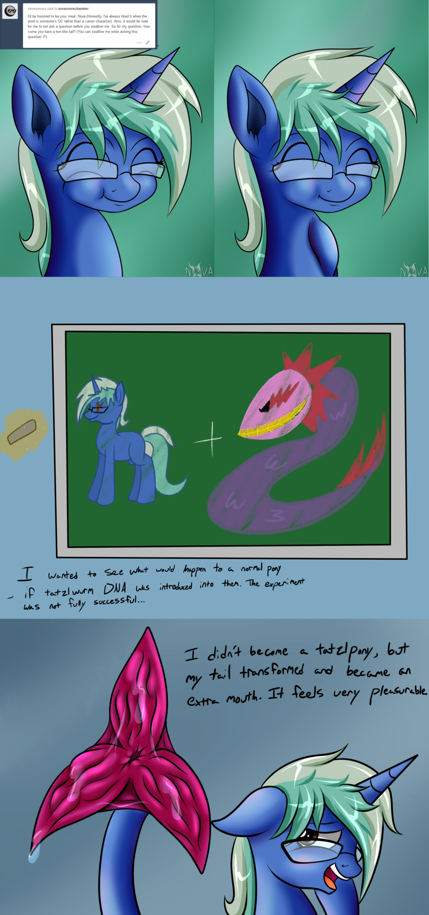 mini comic about why Nova Spark's tail is the way it is. if you can't read the text, basically she spliced her own DNA with Tatzlwurm DNA but it didn't work as expected.