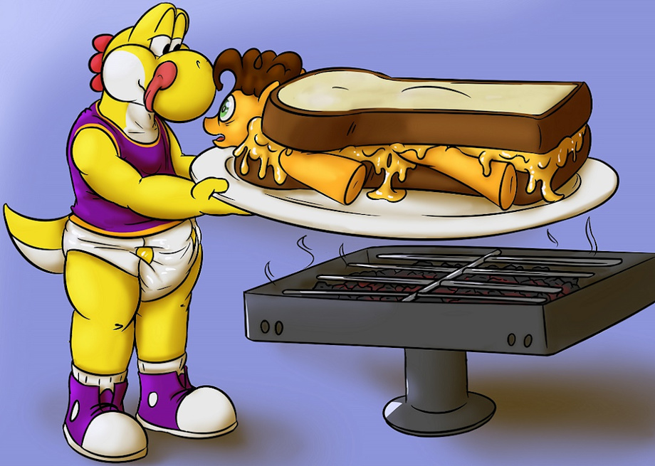 Continuing with the running gag, Showtime's next target is the pony named Cheese Sandwich, who is shown in a cheese sandwich. What better way to prepare such a sandwich than to have it thoroughly cooked.