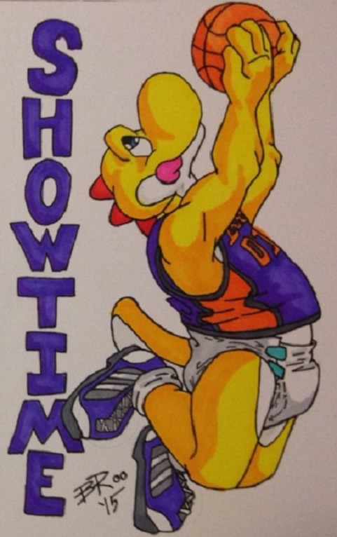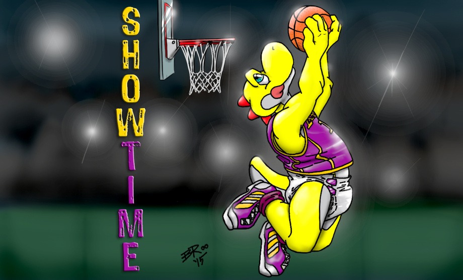 Showtime about to make a reverse dunk. Hopefully his team won't be penalized for him not wearing his shorts.